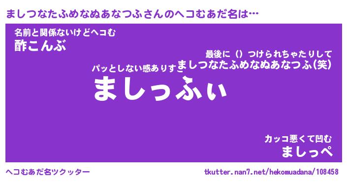 | 男性向けラノベタイトル風あだ名 | 『ましつなたふめなぬあなつふの憂鬱』 |