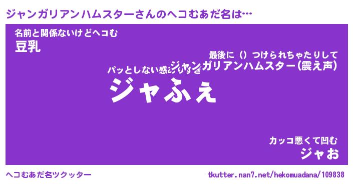 | 男性向けラノベタイトル風あだ名 | 『ジャンガリアンハムスターの憂鬱』 |