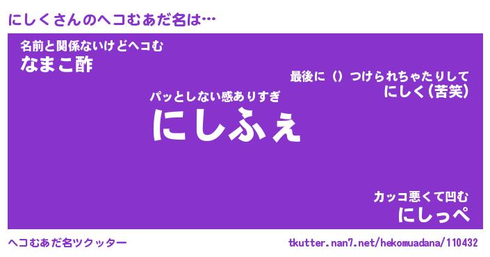 | 2回繰り返すあだ名 | 『にしにし』『ににしし』『うるうる』 |