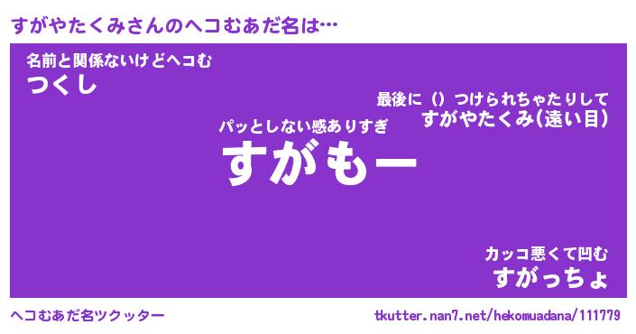 | 恥ずかしいあだ名 | 『プリティーすがやたくみ』『すがっちょ』 |