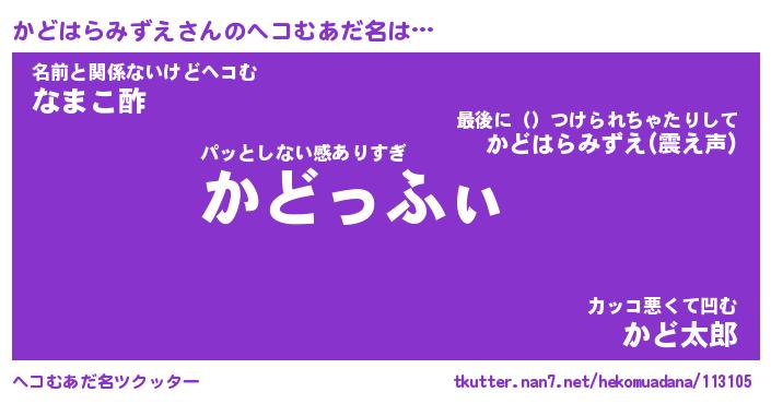 | 男性向けラノベタイトル風あだ名 | 『かどはらみずえの憂鬱』 |