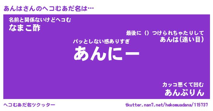 | 意味不明あだ名 | 『ペロリンあんは』『あんはフォーエバー』 |