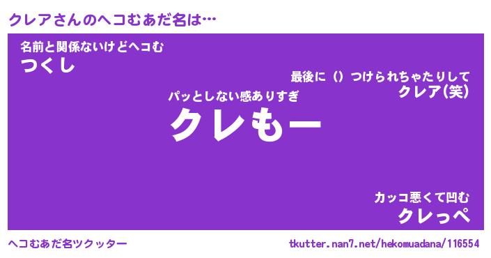 | 意味不明あだ名 | 『ペロリンクレア』『クレアフォーエバー』 |