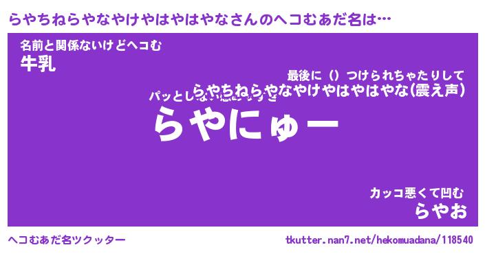 | 男性向けラノベタイトル風あだ名 | 『らやちねらやなやけやはやはやなの憂鬱』 |