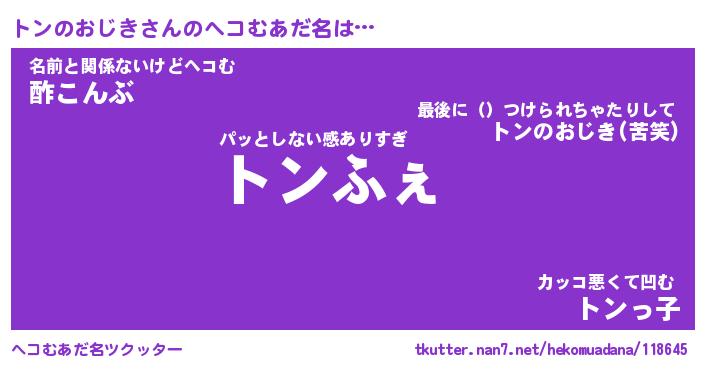 | 男性向けラノベタイトル風あだ名 | 『トンのおじきの憂鬱』 |