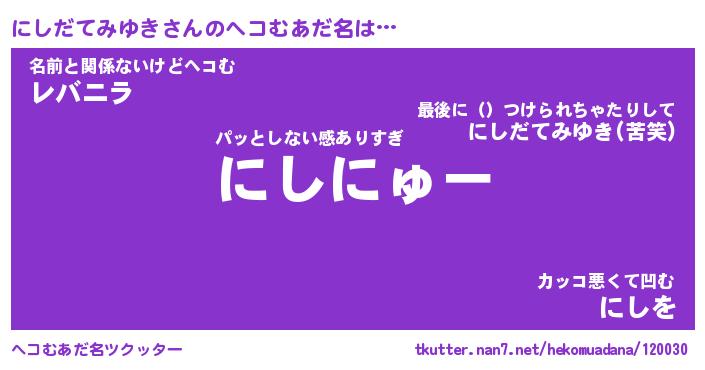 | 恥ずかしいあだ名 | 『プリティーにしだてみゆき』『にしちん』 |