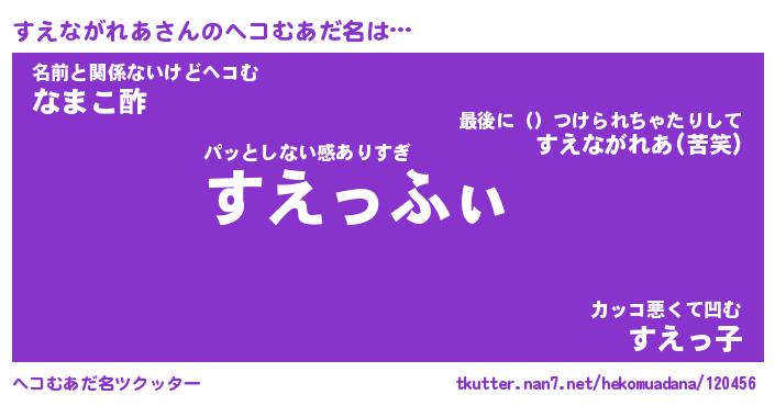 | 男性向けラノベタイトル風あだ名 | 『すえながれあの憂鬱』 |