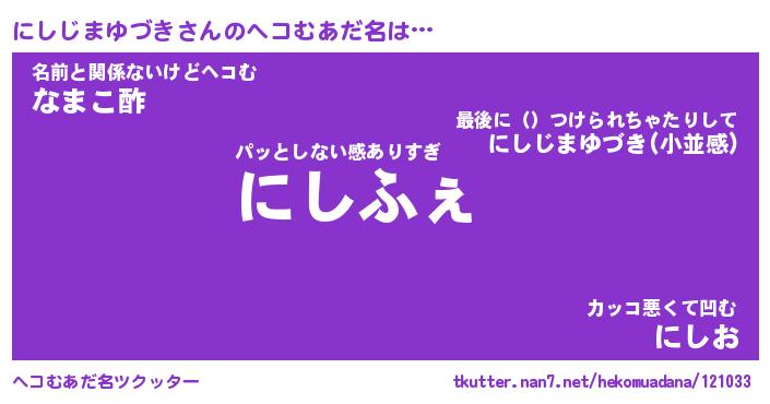 | 料理風あだ名 | 『ほっこり♪にしじまゆづきの味噌そぼろ煮』 |