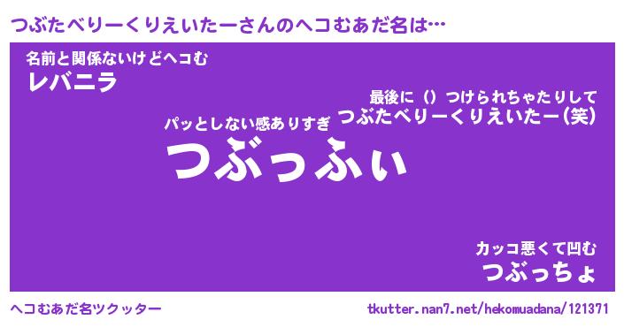 | 欧米人風あだ名 | 『マイケルつぶたべりーくりえいたー』 |