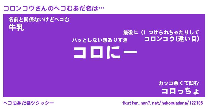 | 男性向けラノベタイトル風あだ名 | 『コロンコウの憂鬱』 |