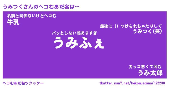 | 男性向けラノベタイトル風あだ名 | 『うみつくの憂鬱』 |