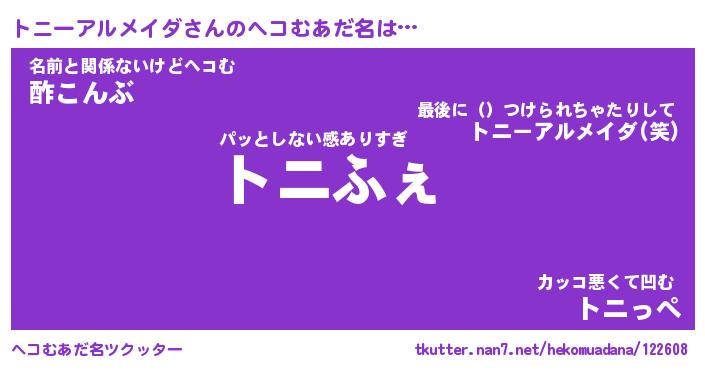 | 男性向けラノベタイトル風あだ名 | 『トニーアルメイダアートオンライン』 |