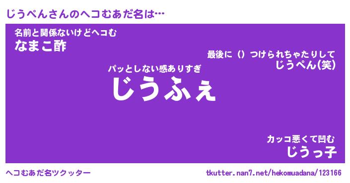 | 意味不明あだ名 | 『ペロリンじうぺん』『永久保存じうぺん』 |