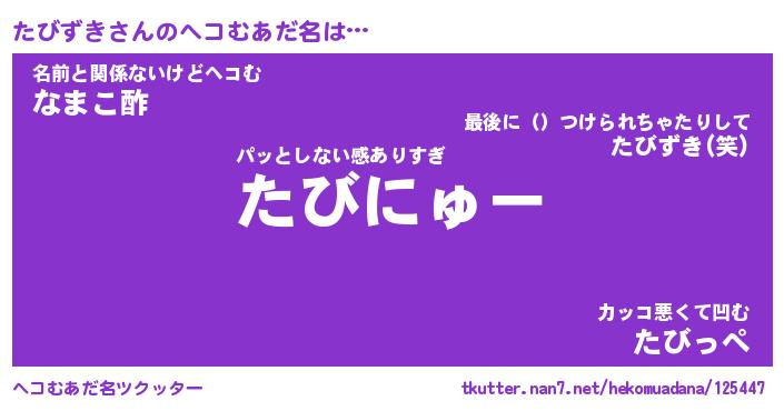 | 意味不明あだ名 | 『ペロリンたびずき』『永久保存たびずき』 |