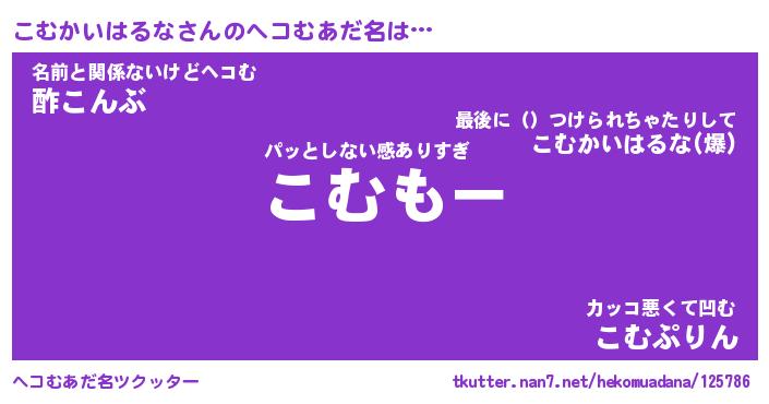 | 恥ずかしいあだ名 | 『プリティーこむかいはるな』『こむちん』 |