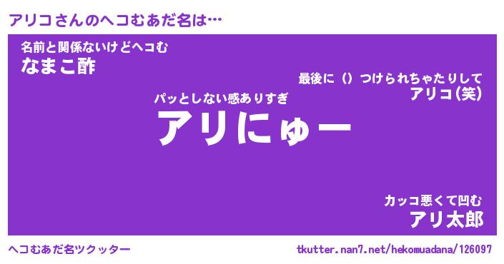 | ヒーロー風カッコイイあだ名 | 『スーパーアリコ』『ウルトラアリコマン』 |