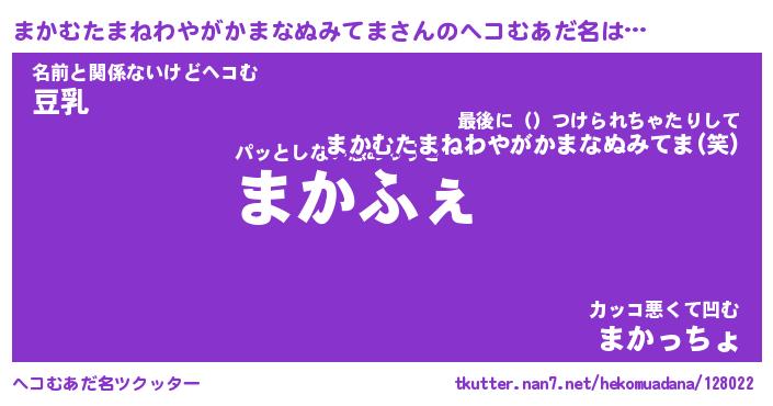 | 女子向けラノベタイトル風あだ名 | 『まかむたまねわやがかまなぬみてま姫と円卓の騎士』 |