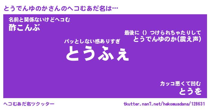 | 恥ずかしいあだ名 | 『プリティーとうでんゆのか』『とうちん』 |