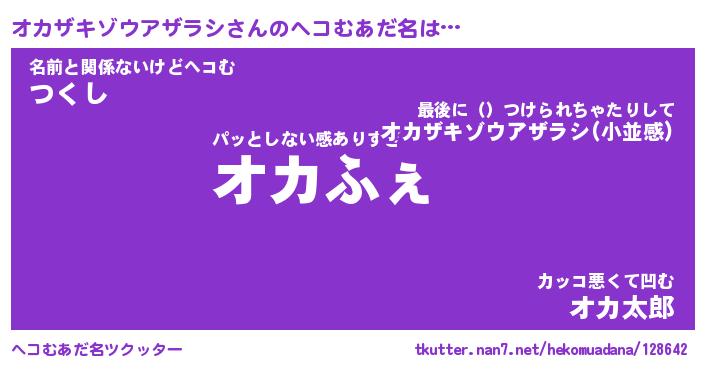 | 男性向けラノベタイトル風あだ名 | 『オカザキゾウアザラシアートオンライン』 |