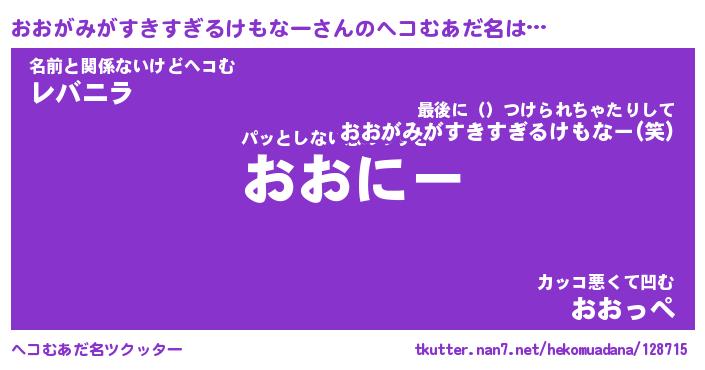 | 恥ずかしいあだ名 | 『プリティーおおがみがすきすぎるけもなー』 |