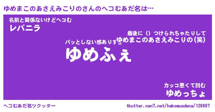 | 男性向けラノベタイトル風あだ名 | 『ユメマコノアサエミコリノアートオンライン』 |