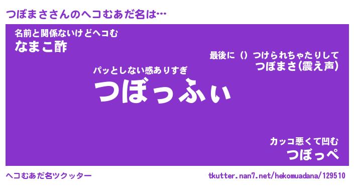 | 2回繰り返すあだ名 | 『つぼつぼ』『つつぼぼ』『ふーふー』 |