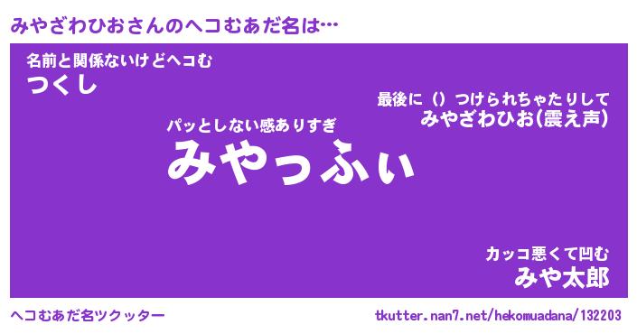 | ヒーロー風カッコイイあだ名 | 『スーパーミヤザワヒオ』『暗黒騎士ミヤ』 |