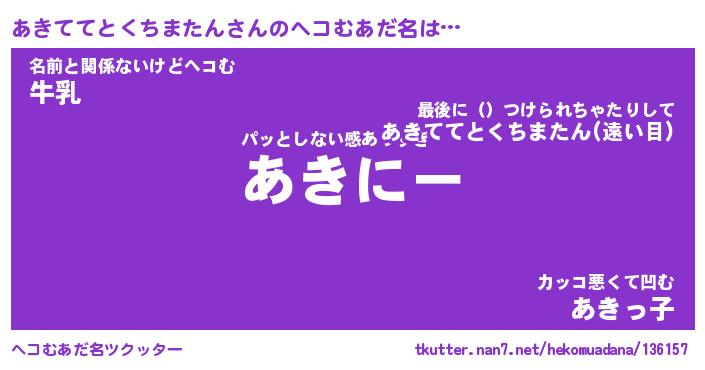 | 男性向けラノベタイトル風あだ名 | 『あきててとくちまたんの憂鬱』 |