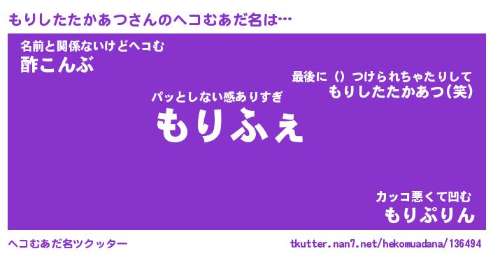 | 男性向けラノベタイトル風あだ名 | 『モリシタタカアツアートオンライン』 |