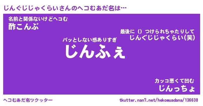 | 男性向けラノベタイトル風あだ名 | 『じんぐじじゃくらいの憂鬱』 |