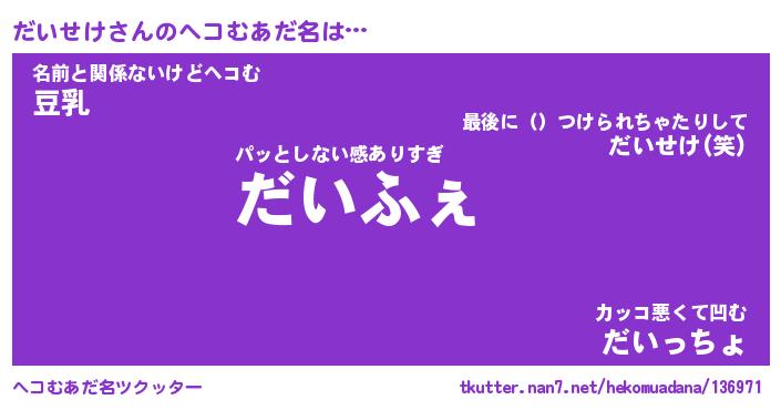 | 意味不明あだ名 | 『ペロリンだいせけ』『永久保存だいせけ』 |