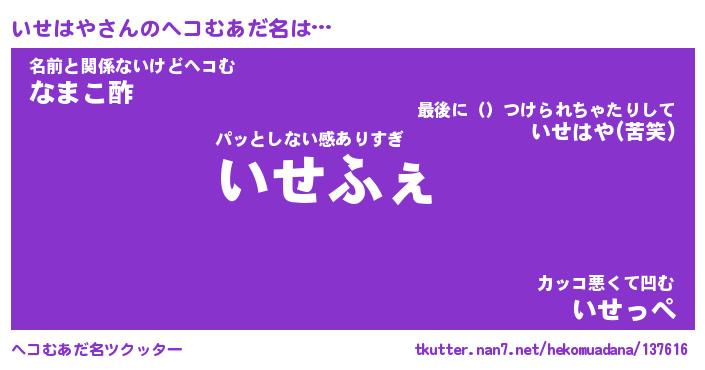 | 意味不明あだ名 | 『ペロリンいせはや』『永久保存いせはや』 |