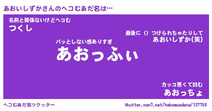 | ヒーロー風カッコイイあだ名 | 『スーパーアオイシズカ』『銀牙騎士アオ』 |