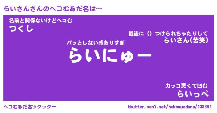 | 男性向けラノベタイトル風あだ名 | 『らいさんの憂鬱』 |