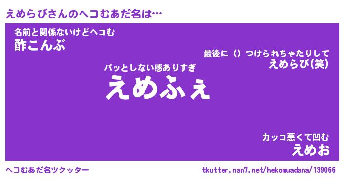 | 2回繰り返すあだ名 | 『えめえめ』『ええめめ』『あんあん』 |