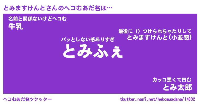 | 男性向けラノベタイトル風あだ名 | 『とみますけんとの憂鬱』 |