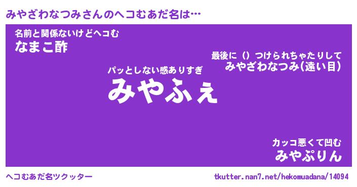 | 男性向けラノベタイトル風あだ名 | 『みやざわなつみの憂鬱』 |