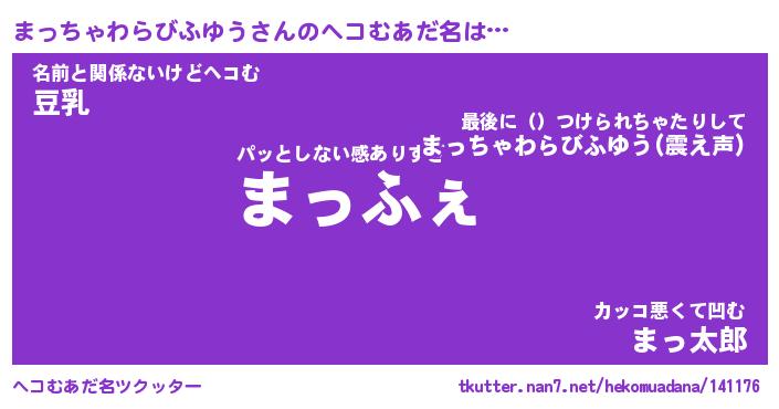 | 欧米人風あだ名 | 『マイケルまっちゃわらびふゆう』 |