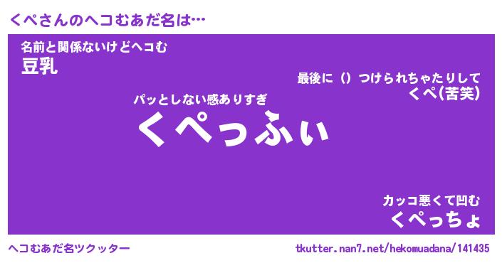 | 女子向けラノベタイトル風あだ名 | 『くぺ姫と円卓の騎士』『くぺ伯爵の花嫁』 |