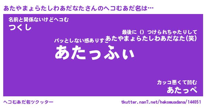| ヒーロー風カッコイイあだ名 | 『スーパーアタヤマョラタシワアダナタ』 |