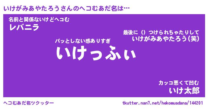 | 男性向けラノベタイトル風あだ名 | 『いけがみあやたろうの憂鬱』 |