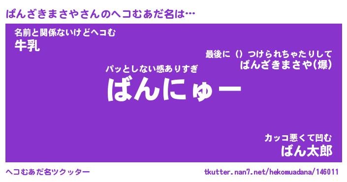 | 恥ずかしいあだ名 | 『プリティーばんざきまさや』『ばんちん』 |