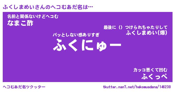 | ヒーロー風カッコイイあだ名 | 『スーパーフクシマメイ』『魔戒騎士フク』 |