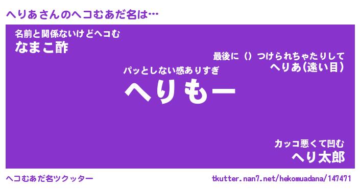 | ヒーロー風カッコイイあだ名 | 『スーパーヘリア』『ウルトラへりあマン』 |