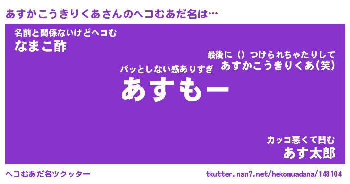 | 男性向けラノベタイトル風あだ名 | 『あすかこうきりくあの憂鬱』 |