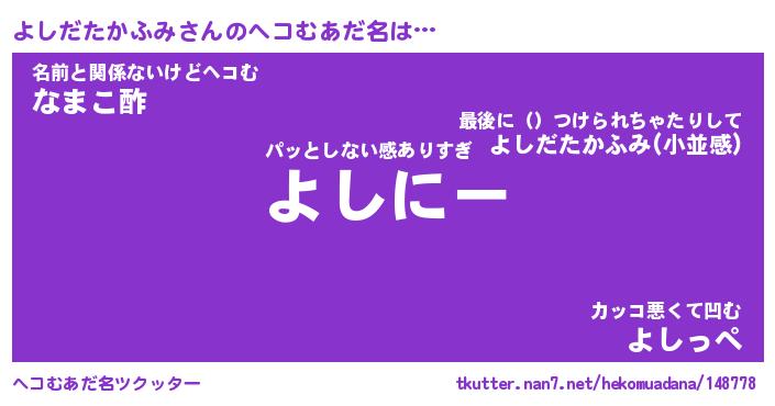 | 恥ずかしいあだ名 | 『プリティーよしだたかふみ』『よしちん』 |