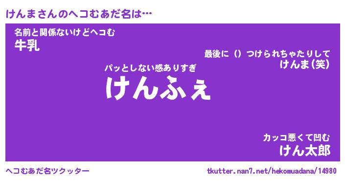 | 意味不明あだ名 | 『ペロリンけんま』『けんまフォーエバー』 |