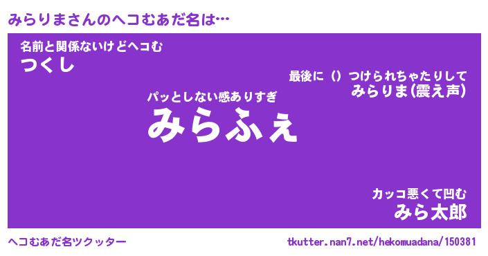 | 欧米人風あだ名 | 『マイケルみらりま』『ウサインみらりま』 |