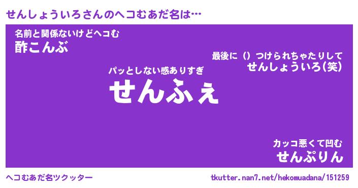 | 男性向けラノベタイトル風あだ名 | 『せんしょういろの憂鬱』 |