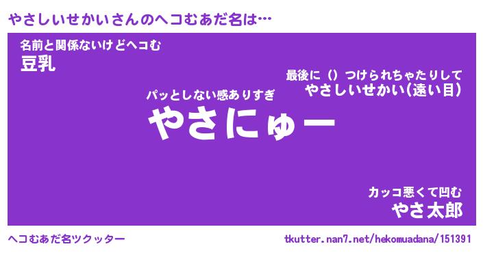 | 自動車の名前っぽいあだ名 | 『ヤサティマ』『ヤクア』『ヤント』 |